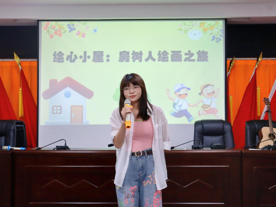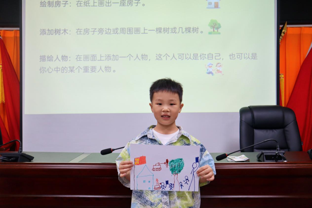 7月6日下午,衡阳市岳屏镇东湖村二楼大会议室洋溢着童真与色彩。由衡阳师范学院教育科学学院“青葵湘阳,青春筑梦”携爱志愿服务团的心理健康教育硕士袁熠烽策划,王星主持,机动志愿者陈胜昔、何英旗、何悦凤、彭艺、李乐、张婕、黄熔熔、黄静怡、周思彤、方宇轩全程保障的“绘心小屋:房树人绘画之旅”心理活动温情开启,为乡村儿童搭建起一座用画笔表达心灵的桥梁。
