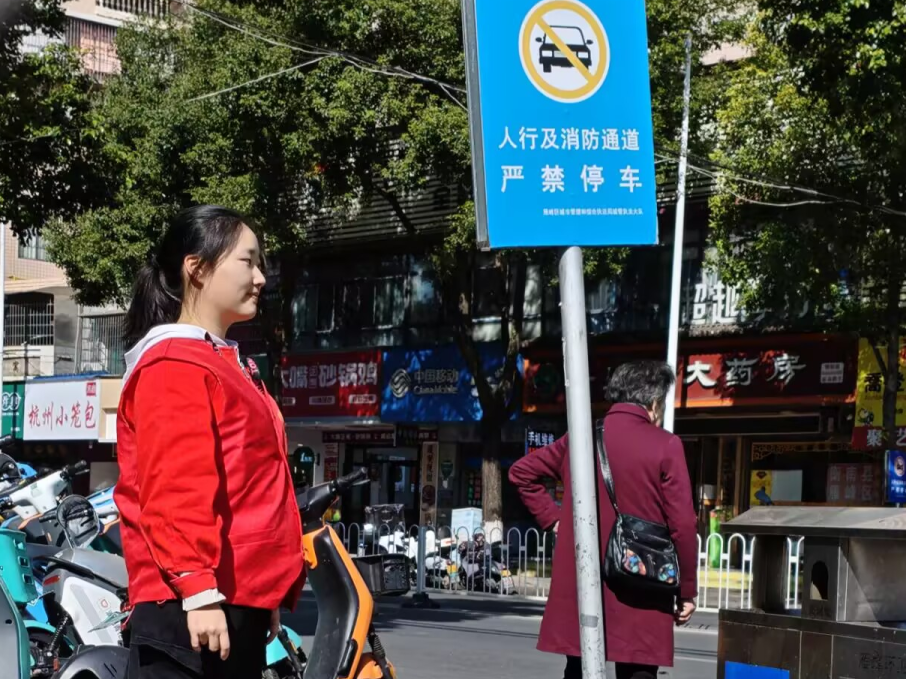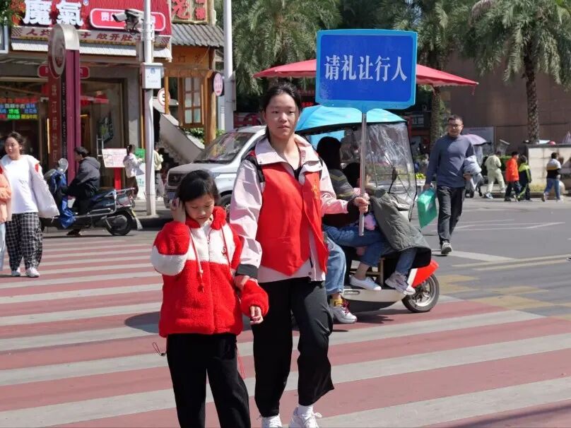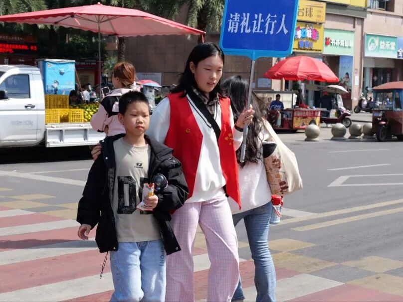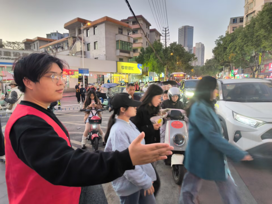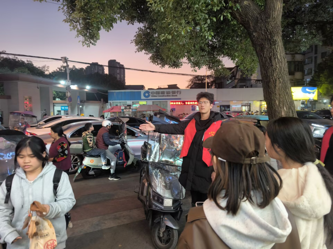 人流高峰时段,志愿者们身着红马甲、手持引导牌准时到岗。校门口,他们引导学生有序进出;周边道路上,他们疏导车辆即停即走;小巷出口处,他们示意车辆减速礼让;遇到低年级小学生过马路,更是主动上前牵手护送。“看着道路变通畅,孩子们安全通过,再辛苦也值得!”教育科学学院志愿者方宇轩擦着额头的汗珠说道。