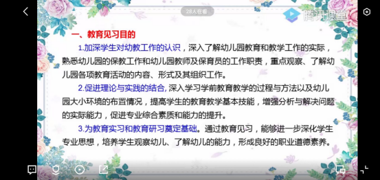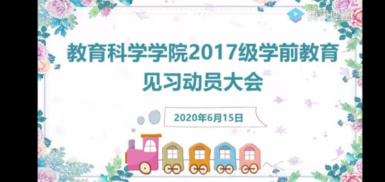 教育见习是学前教育专业教学计划的重要组成部分,是培养学前教育师资的基本环节。由于受到新冠疫情影响,无法开展线下教育见习,鉴于此,衡阳师范学院教务处同意各学院开展线上教育见习。为了切实做好本次线上教育见习工作,教育科学学院学前教育教研室特此于6月15日10:00-10:30在腾讯课堂上举行线上见习动员大会,做好见习前的各项准备与安排工作。根据学前教育专业教学计划的安排,本次见习为期一周,定于2020年6月15日至2020年6月19日。