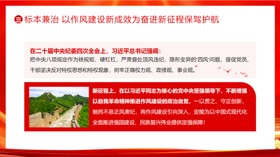 党课现场,授课人从“八项规定何以深刻改变中国”的深入剖析,到对中央八项规定精神中“厉行勤俭节约、反对奢侈浪费和奢靡之风、廉洁从政、工作作风务实”等要点的详细阐释,授课人以深入浅出的方式,结合实际案例,生动解读中央八项规定精神内涵及其深远意义。强调了党中央坚持不懈推进八项规定精神贯彻落实,坚决破除特权思想、特权行为,推动党的建设在自我革新中蓬勃发展。