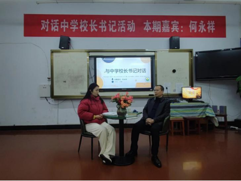 2022年12月1日下午,衡阳师范学院教育科学学院与资兴市立中学在资兴市立中学图书馆二楼团体辅导室成功举办了“对话中学校长书记活动”。本次对话的嘉宾是郴州市教育学会常务理事、衡阳师范学院客座教授、资兴市立中学党总支书记何永祥,衡阳师范学院心理健康教育硕士生王星畅主持了此次活动。资兴市心育名师工作室首席专家、资兴市立中学学生发展中心主任袁芳荷,资兴市立中学青年教师代表,衡阳师范学院2021级心理健康教育专业资兴市中学实习生线下参加、其他教育硕士近60人在线上参加。