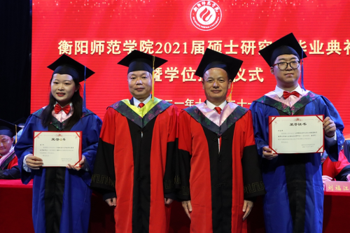 研究生院院长罗文宣读《关于表彰衡阳师范学院2021届优秀毕业研究生和优秀硕士学位论文的决定》。主席台领导为校优秀毕业研究生、校优秀硕士毕业论文、省级优秀研究生导师、省级优秀研究生导师团队获得者颁奖。