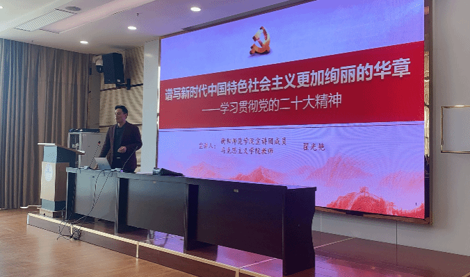 2023年3月7日下午,学校宣讲团成员、马克思主义学院教师翟光艳在东校区图书馆213学术报告厅为教育科学学院师生作题为《谱写新时代中国特色社会主义更加绚丽的华章——学习贯彻党的二十大精神》的报告,教育科学学院组织了在读教育硕士参加。报告会由谢伟华党总支书记主持。